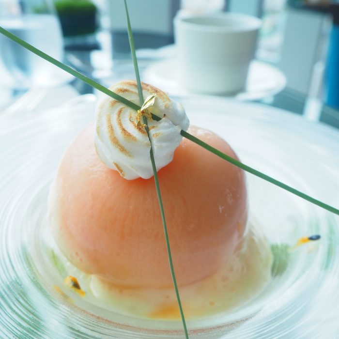 一皿目は桃のスープの上にレモンバーベナ風味のエスプーマ