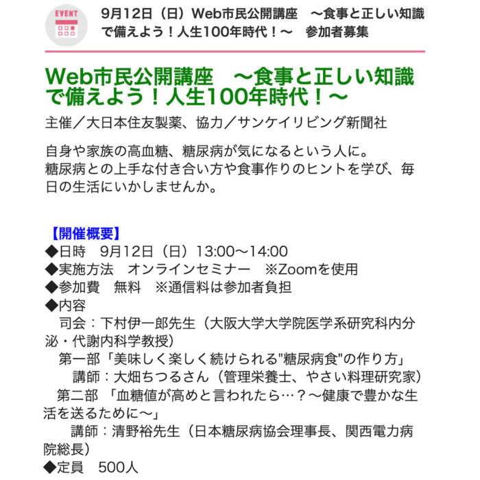 講座・講演会【参加者募集】住友ファーマ(株)主催、糖尿病食webセミナーに登壇します